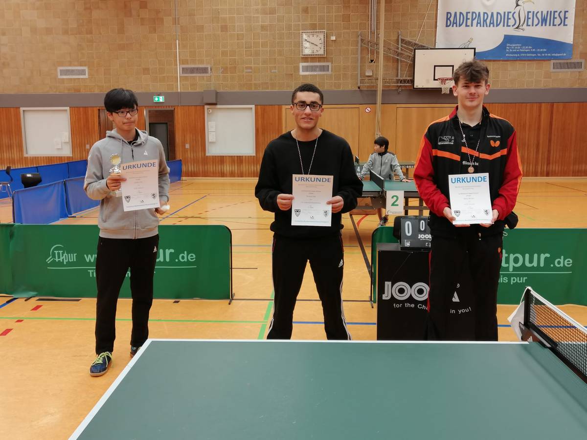 erfolgreich die Gruppenphase abschließen. Zum Pech aller liefen jedoch alle SCWler in der KO-Phase gegeneinander. Im Achtelfinae trafen bereits Peer und Gunnar aufeinander, im Viertelfinale Malte und Gunnar, sowie Youbin und Eunbin. Im Halbfinale spielten dann in einem finalwürdigen Spiel Malte gegen Eunbin, welches Eunbin im fünften Satz für sich entscheiden konnte. Das Finale um den Bezirksmeistertitel gegen Youssef Eid aus Braunschweig verlief mit 3:0 dann eher deutlich.